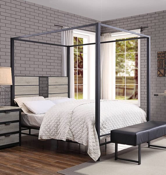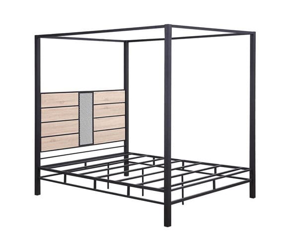 The Barra canopy bed is a contemporary twist on a classic look, boasting clean lines and featuring a panel headboard and low profile footboard in a unique mix of natural hardwood and sandy gray finished metals.