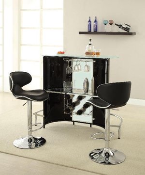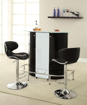 Bar Unit & StoolsImpress your guests with this contemporary bar unit that will bring sleek modern style into any space. With a unique kidney-shaped body in a cool black and white acrylic, this bar unit offers plenty of storage for your every organizational need. A stemware rack, wine bottle storage, and glass preparation surface all provide this unit with convenient functionality that will make entertaining guests a breeze. The wrap-around chrome footrest offers support and additional comfort, while a frosted tempered glass counter surface completes the cool updated style of the piece.Bar Unit Dimensions: 47.25\”L x 22\”W x 43.25\”HBar Stool Dimensions: 19\”L x 18\”W x 35\”~40\”H*Item NOT Eligible for Refund/Return*