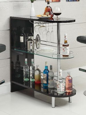 Bar TableThis contemporary bar table is a sleek option for your living room or dining room. The unit includes a unique shape with an arch shape to the table top and shelves. A center glass shelf complements the black color, and chrome color accents on the railing, feet, and support road. Stemware storage where you can hang wine glasses adds to the sophisticated style of this bar unit.Dimensions: 39.25\”L x 15.75\”W x 41\”H*Item NOT Eligible for Refund/Return*
