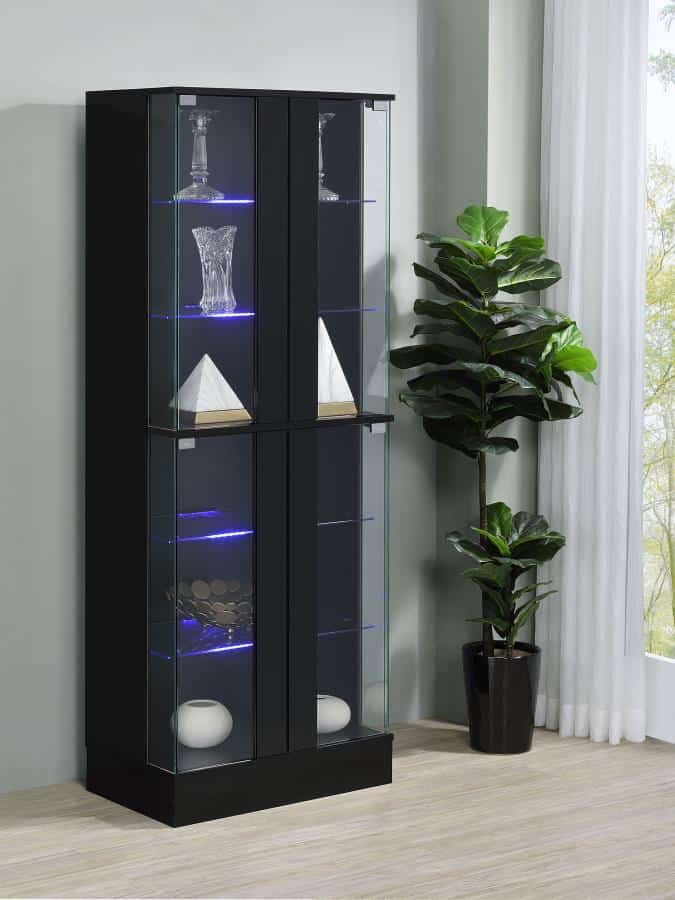 Discover sophistication and functionality fused in this sleek curio display cabinet, a stylish centerpiece for any room. The high gloss laminate on engineered wood gives a luminous sheen, complemented by clear tempered glass doors that encase six tiers of shelving. Each shelf basks in the glow of integrated LED lights, perfect for showcasing your treasures with a touch of modern elegance. The two-door design invites a clear view into your curated collection, while the robust construction promises longevity. This cabinet is not just furniture; it’s a statement of refined taste and practical luxury.