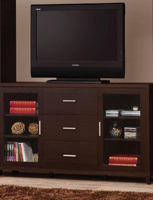 This sleek entertainment wall unit has a simple design and plenty of storage space with adjustable shelves and a large stable surface for your television that will provide your living, family, or entertainment room with an exquisitely crafted and stunning focal point. Finished in a rich cappuccino wood finish, this piece makes decorating simple and matching furniture and your own personal design style with it super easy. Item made from particle board.