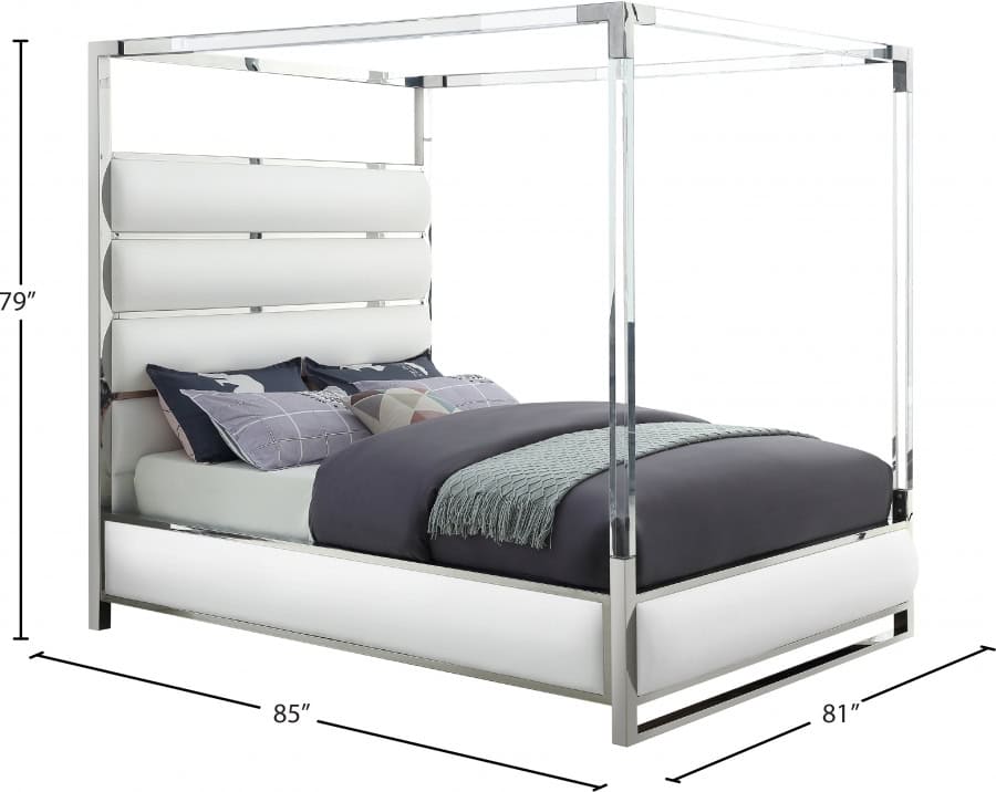 Give your bedroom a modern makeover with this Encore white faux leather king bed. Eye-catchingly elegant, this bed features a boxy canopy design for a grand presentation in your space. Acrylic posts add a contemporary feel to the bed’s overall look, and the heavily padded headboard is upholstered in soft white faux leather that’s durable and tough yet gives the same supple effect as real leather. The matching footboard is also padded for a cohesive presentation in your room.