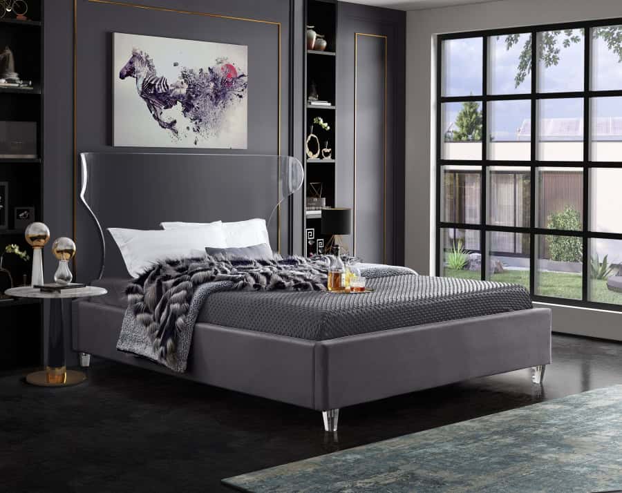 There’s nothing scary about the Ghost Grey velvet full size bed, with its plush cushioned and upholstered side rails and footboard. A curved transparent acrylic headboard allows you to situate it in front of a window without blocking the view, and matching acrylic legs offer a beautiful contemporary appearance. This bed has a complete set of slats included for your convenience, so you won’t need to purchase a box spring.