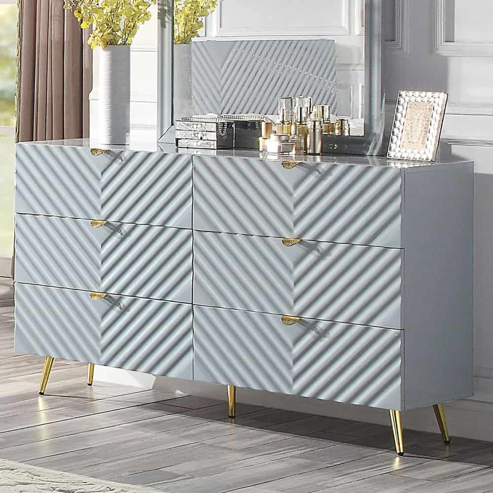 The Gaines Collection is a glamorous and sophisticated grouping that adds a chic style to any room. The gray gloss finish and gold metal accents help to accentuate the clean lines of the pieces and add a pop of glamour. The diagonal line design adds visual interest and texture, making each piece stylish. With a variety of storage options to meet your needs.