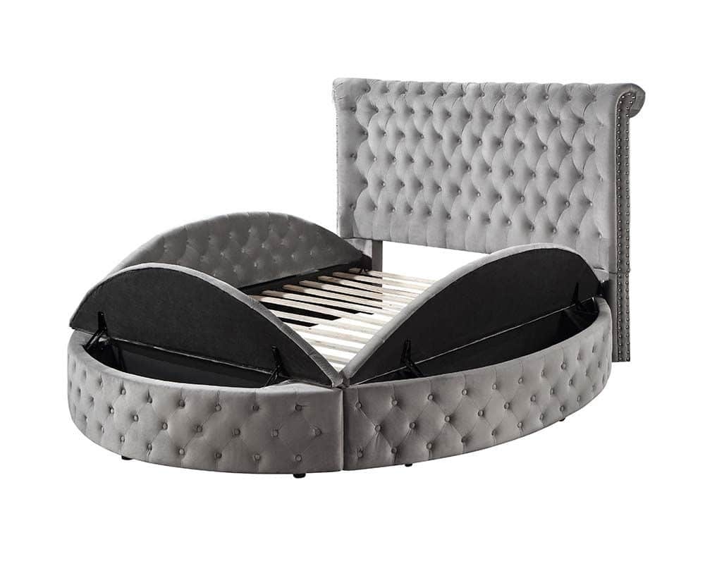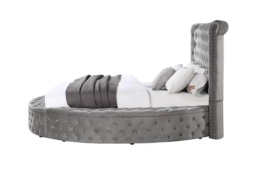 With a lavish movie star modern design, the Gaiva bed adds drama to your bedroom dcor. It has a tufted upholstered velvet fabric headboard and footboard. Built on a wooden frame with nailhead applications to add elegance to the bed. Adding further appeal to the piece, the headboard and frame are button-tufted.