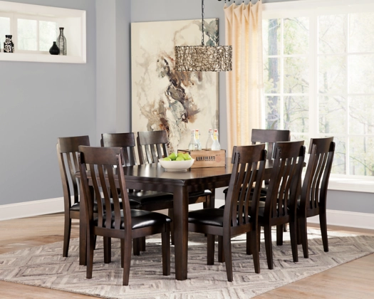 Take clean-lined, classic styling. Add modern comfort. Top with a deep, complex finish that exudes rich sophistication. That’s the look and feel of this dining table set with built-in butterfly leaf extension to accommodate guests. Eight rake-back upholstered chairs make it complete.
