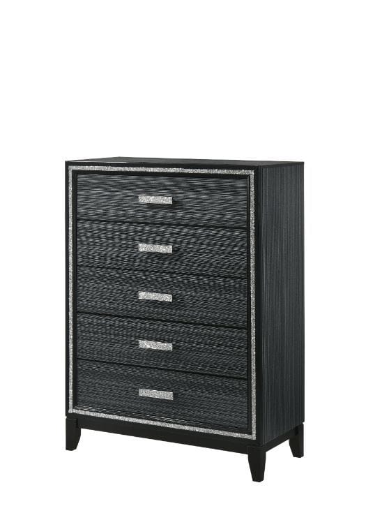 Classic design with touches of modern aspects makes this Haiden Chest ideal for any bedroom. The piece offers a rectangular table top and five storage drawers for displaying or organizing. It also features a glamorous shimmering silver accent trim that adds richness to design. The drawer handles carryover the same shimmering silver to tie them all together to create a cohesive look. The black finish makes it easy to fit into already existing decor.