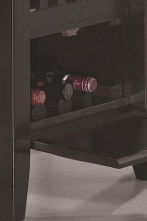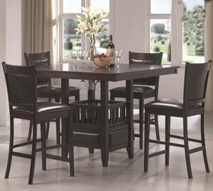 Dine in casual comfort with the Jaden Counter Height Table. Square in shape, this table is crafted from select hardwoods and okume veneers with a rich cappuccino finish. A square storage table base includes a center storage cabinet with wine glass holders, allowing you to make the most of your dining space. Vinyl padding on the storage cabinet\’s sides adds a visual detail to impress. Modern with a simple yet stylish design, this table is appropriate for both formal or casual dining environments. Pair with the matching counter height stools to complete your dining space and outfit your home.