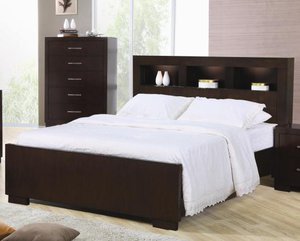 Queen Size BedCreate a sophisticated contemporary look in your master bedroom with this unique and stylish bed. This bed will be the focal point, offering clean lines, rich warm finished wood, and a sleek headboard with storage compartments to show off your favorite decorative accents. Built in lighting creates a stunning display, creating a relaxing mood that you are sure to love. This bed is available in queen, king, and California king sizes to meet your needs and fit your space. Dimensions: 89\”L x 66\”W x 47\”H*Box Spring Foundation Not Required**Headboard Includes Lights**Item NOT Eligible for Return/Refund*