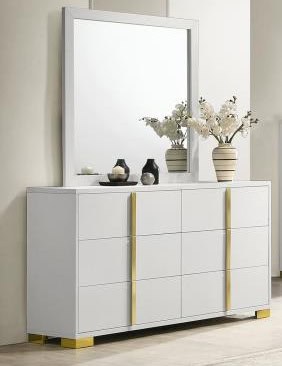 Soak up the sleek and simple yet compelling look of a six-drawer dresser with a dramatic aesthetic that changes the tone of your contemporary bedroom. Modern design details produce a chic vertical dresser with an Art Deco vibe and tons of storage space. Made of wood products, this six-drawer dresser features a versatile finish with glam accenting from gold finish metal, placed carefully to emphasize a geometric linear effect. Store incidentals and accessories in drawers operating smoothly on center metal glides. English dovetail drawer construction embellishes this dresser’s quality, as vertical gold metal drawer hardware offers a unique impact.