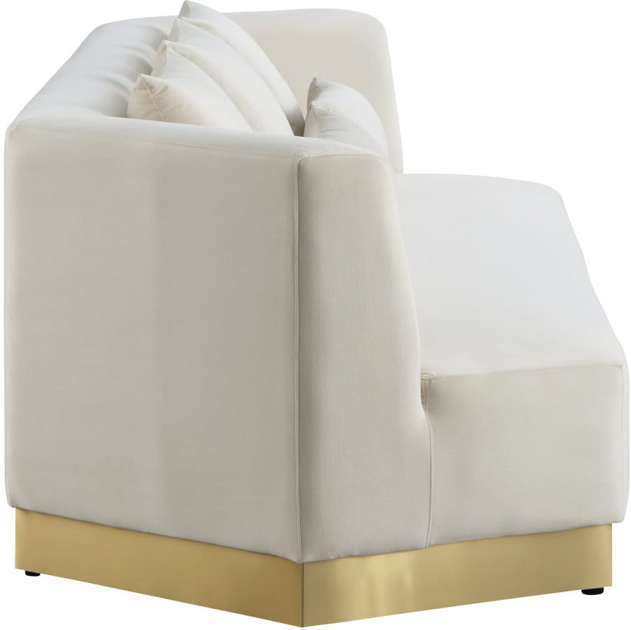 Revamp your living room, den or great room with this Marquis velvet sofa. This handsome piece features a bold contemporary look that’s well at home in most modern décor themes. Plump pillows add a little something extra to make you feel extra cozy. Upholstered in soft cream velvet, this piece fits in nicely with nearly any other colors in the room, and the brushed gold stainless steel base ensures its up-to-the-minute look.
