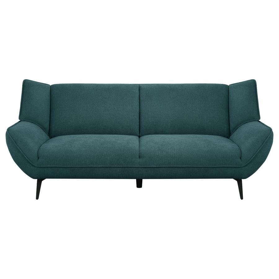 An iconic Mid-Century Modern motif will look great in your casual living room or den. This comfy and stylish sofa recreates retro design elements and ensures the commitment to easy, comfortable relaxation. This sofa features gorgeous teal fabric upholstery that opens up possibilities for a lush room palette choice. Flared arms and wing backs attach to non-removable seat and back cushions. Tapered black metal legs coordinate with the beautiful teal upholstery.