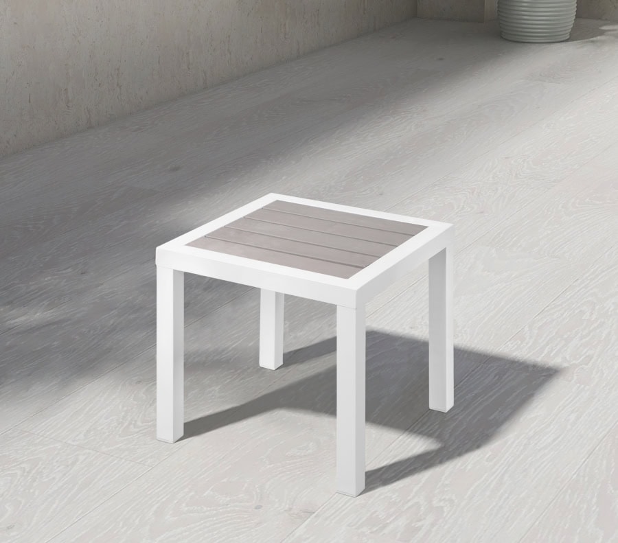 Add the comforts of indoors to your outdoor living space with this Nizuc end table. This sophisticated modern table is an ideal spot for resting a frosty drink on a sunny day. The top of the table is made from light grey Wood Look accent paneling and is slatted, so moisture dissipates easily through its cracks. An aluminum frame adds resilient durability to this table’s design, ensuring it lasts and lasts, season after season.