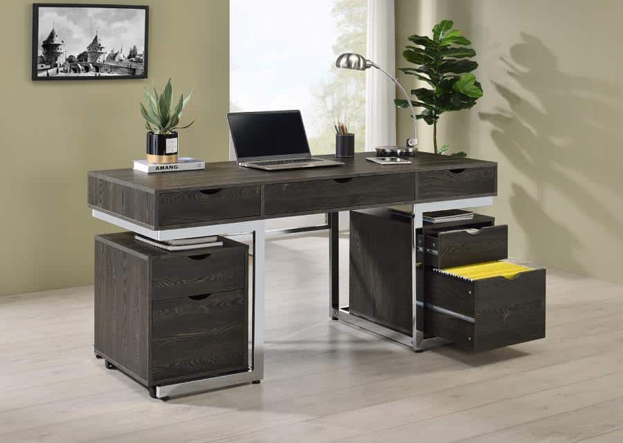 - Three-piece set includes: writing desk and two file cabinets