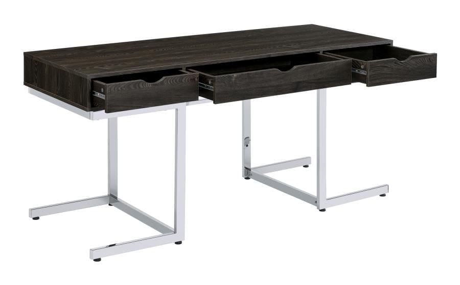 - Writing desk features three storage drawers with full extension glides for abundant storage space