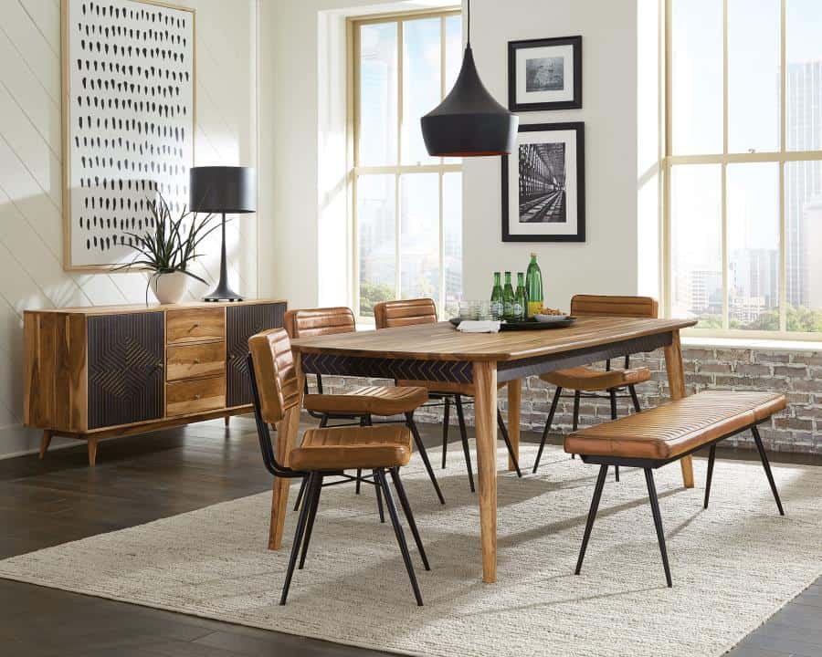 Attention to detail offers a calming sense of elegance to a casual dining set created for comfort and aesthetics. Start fresh with a set anchored by a natural finish sheesham table with a spacious rectangular top and tapered, rounded legs. A dark apron with geometric design detail adds an energizing effect. Mid-Century Modern influence styles easy side chairs with scoop seats and a thick back, both with channeling. Metal framing features iconic retro slender rounded, splayed legs, as a long dining bench opens up options for extra seating.