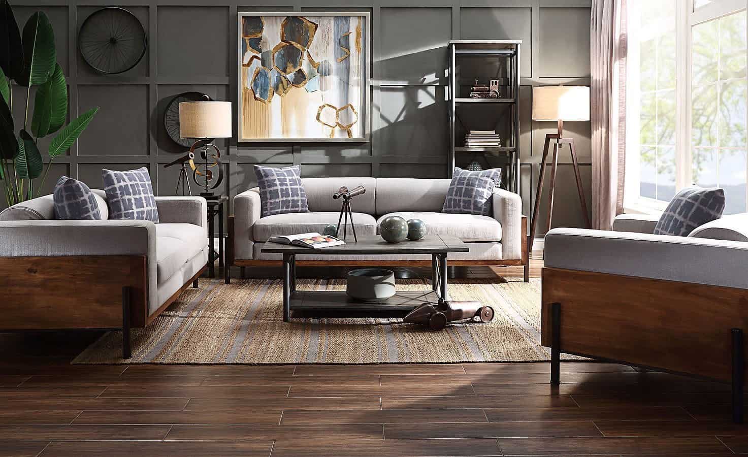 Our Acme exclusive Pelton living room set will be the star of your living area. With deep, comfortable seats wrapped in a high shelter backrest in a beautiful walnut finish, this set also features metal legs that lend a lightness to each generously-sized piece. On-trend loft style is yours with Pelton!