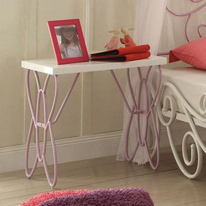 NightstandThe Acme Furniture Priya II Nightstand sets a magical tone in your little girl’s room. The smooth engineered tabletop boasts a crisp white finish that glows. It’s supported by a butterfly shaped frame that’s covered in a deliciously girly purple hue.Engineered wood tabletop, metal frameCrisp white finishButterfly design on framePurple coating along frameDimensions: 22W x 16D x 22H in. *Item Eligible for Refund/Return*