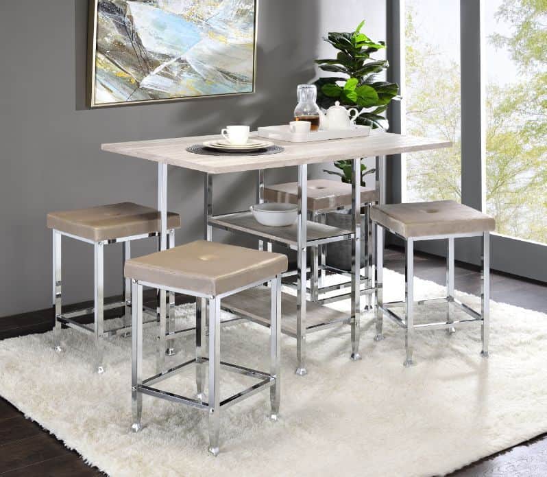 Alluring in its simplicity and function, this versatile counter high table is design with two open shelves on the base. Comprised of stark lines and sleek angles, its modern metal base paired with wooden shelves tell us simple really is better. A chrome finish gives the table a glam look and feel. It offers a spacious table top and storage compartments that work great in homes with limited space. Associated your space with simplicity, neutral tone, and clean lines, the contemporary-style counter high stool matches any decor of a dining room. The padded seat cushion is fully covered in a soft beige velvet, sitting atop a metal base shining with a chrome finish. Footrest is added to the metal base for extra durability and support. Give your dining room a minimalist design look and feel with the Raine counter height set.