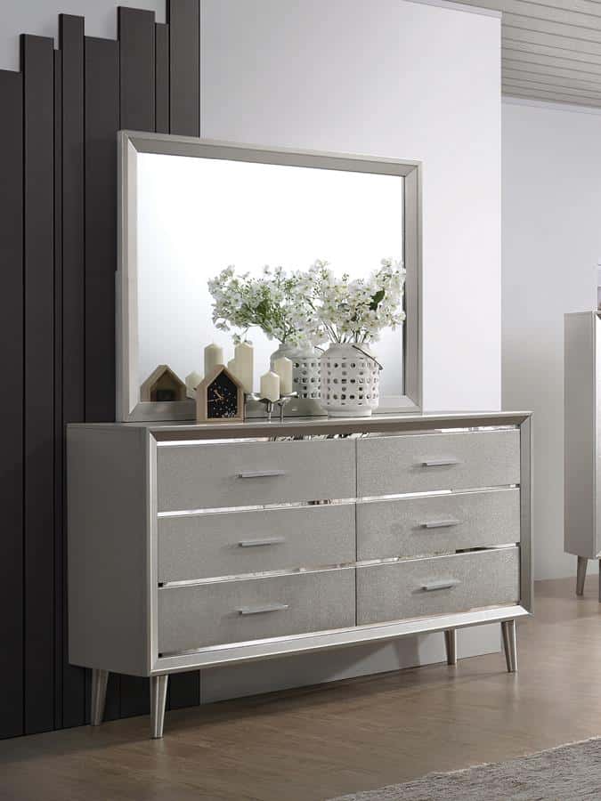 Round tapered wooden legs and wide metal hardware speak to the mid-century modern elements of this collection. Metallic silver finish and mirrored acrylic horizontal reveals, combines with beveled picture frame design for a specific look. Mid-century modern meets city glam to create this fun sparkling eye candy.