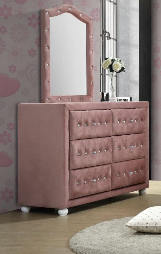 The Reggie youth bedroom set in pink is full of character! Every piece in this glamorous collection features crystal-like button tuft details and cute wooden-bun legs in a crisp white finish. The panel bed features an arched headboard with a gentle curve that’s echoed in the dresser mirror. Safety stops are included on all case good drawers, as well as crystal-like pull knobs for an extra sparkle. Let the delightful Reggie collection dress up your home.