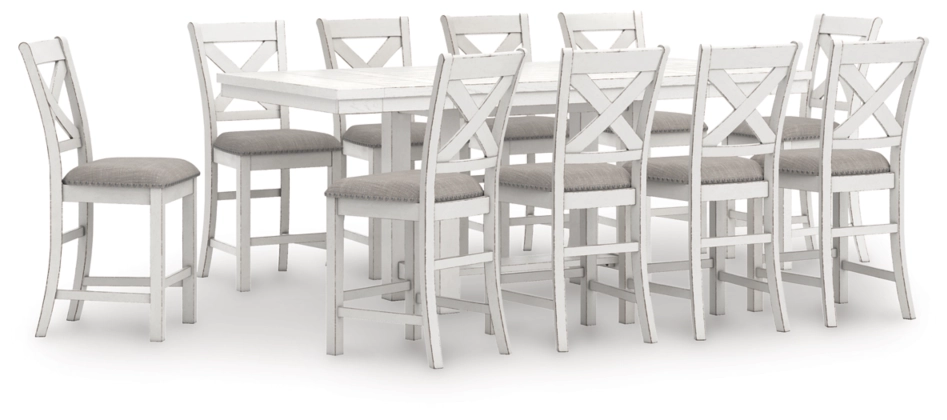 This dining package is sure to impress come mealtime. With its antiqued white finish and a planked effect tabletop, farmhouse-style dining has never been so fashionable. All that’s missing is you and your family.