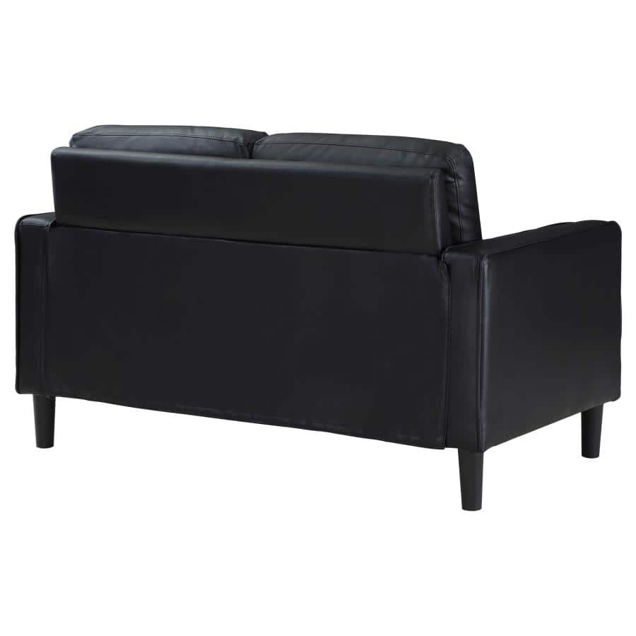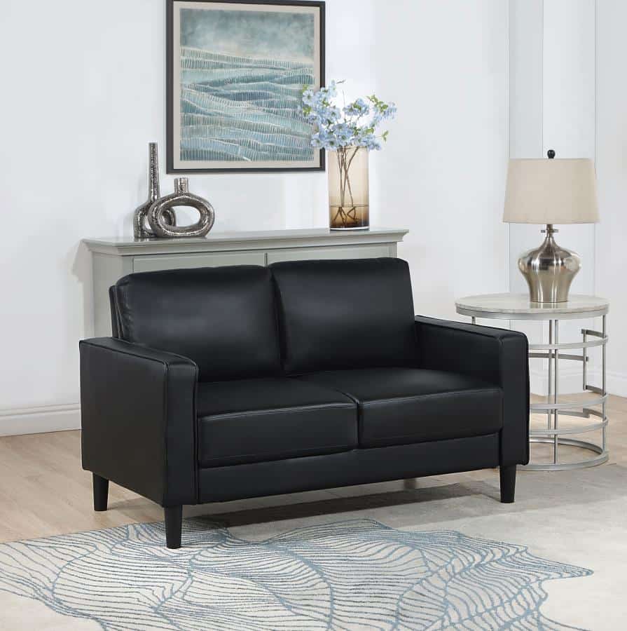 A compact profile makes this modern loveseat the perfect choice to add seating in a living room or den. It’s a structured silhouette complete with track arms. Faux leather upholstery is supple and smooth, offering contemporary style and sophistication that impresses without overwhelming. Plush cushions provide wonderful comfort for lounging, with sinuous spring decking under seats and a webbed back. Tapered, straight legs offer a chic finishing touch, providing support and stability.