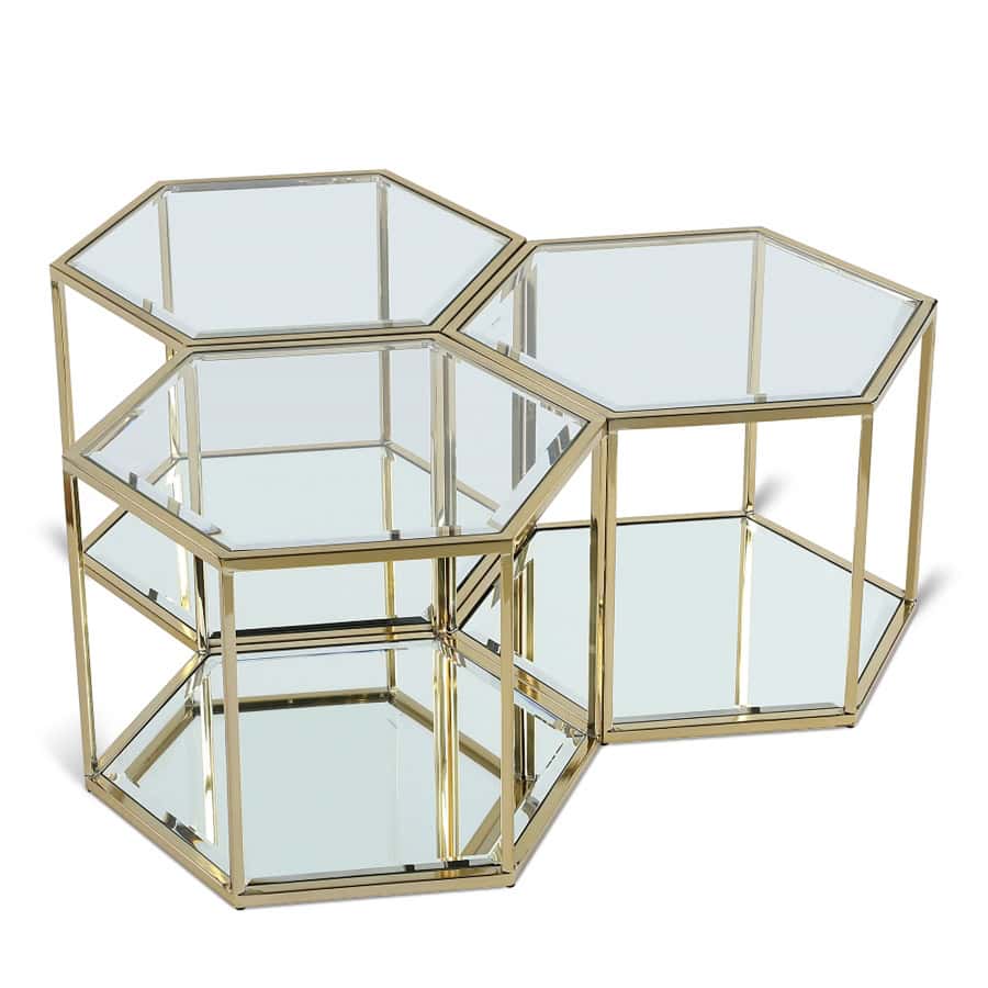 This SEI coffee table three-piece set puts you in complete control of the look of your space. Use a single table for a small space, or put together two or more tables for an expanded look when game night requires extra room for you to spread out. The beautiful brushed gold frame holds a glass top with mirrored base and parallel mirrored bottom shelf. The modular design lets you connect as many tables as you need for a custom solution to your requirements.