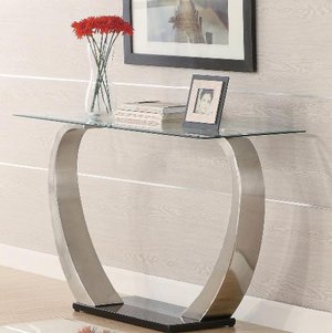Sofa TableEnhance the flow of your contemporary style throughout your living room with this sofa table. It features striking curved metal legs with a high sheen black base. A floating glass top completes this sleek piece. For the perfect placement, arrange this sofa table next to your modern sofa or against the wall. Great for photographs, flowers, and other decorative pieces, this sofa table will make your living room décor come alive. Complete this set with the coffee table and end table from this collection.Dimensions: 48\”L x 18\”W x 30\”H*Item NOT Eligible for Refund/Return*