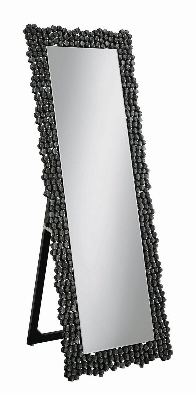 This full-length Silver and Smoke Grey Standing Cheval Mirror features a dramatic black rhinestone frame that adds a glamorous effect to any home. With its dashing sparkle, this piece makes a stunning addition to a luxurious master bedroom, vintage-inspired living room, or a large dressing room. Add this piece to any room to infuse the space with dazzling style.