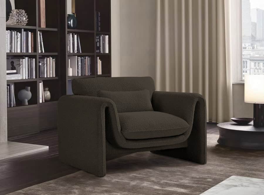 Impress family and guests alike with this Stylus boucle fabric chair. This modish chair oozes contemporary panache with its curved arms and unexpected design elements. Thickly padded seat and back cushions cradle your body in supportive comfort while the rich brown boucle fabric caresses the skin and leaves you feeling relax and recharged. A wood frame ensures that the chair withstands the rigors of daily use without losing its lovely yet contemporary look.