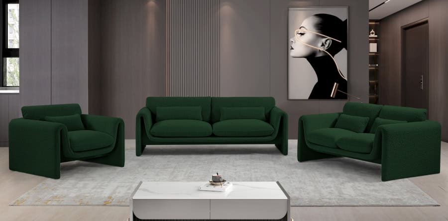 Impress family and guests alike with this Stylus boucle fabric sofa. This modish chair oozes contemporary panache with its curved arms and unexpected design elements. Thickly padded seat and back cushions cradle your body in supportive comfort while the rich green boucle fabric caresses the skin and leaves you feeling relax and recharged. A wood frame ensures that the chair withstands the rigors of daily use without losing its lovely yet contemporary look