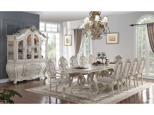 Table, (6) Side Chairs, and (2) Arm ChairsThe Ragenardus formal dining collection shows traditional style that is designed to impress. Each piece of this collection demonstrates delicate craftsmanship and intricate carved detail. Matching hutch and buffet reflect all carefully selected design that will be the showpiece of your formal dining room. Table Dimensions: 44\”W x 90\”~114\”L *Includes 1 x 24\”Leaf*Side Chair Dimensions: 43\”HArm Chair Dimensions: 43\”HSeat Depth: 19\”Seat Height: 19\”*Item NOT Eligible for Refund/Return*