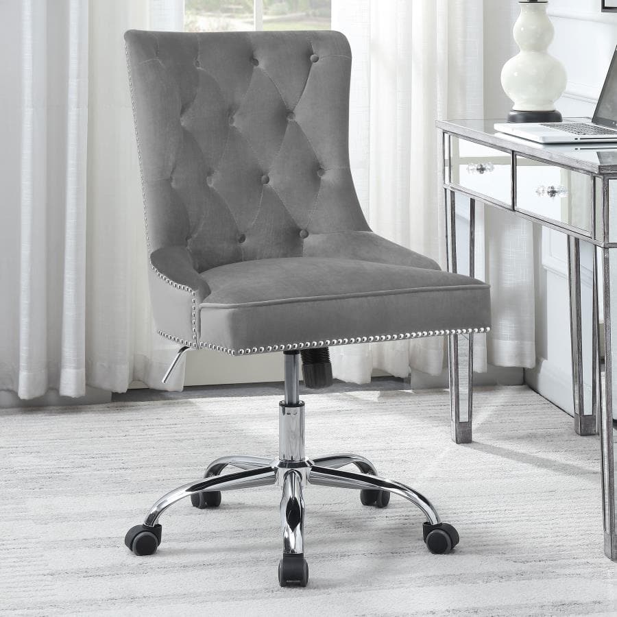 Add versatile convenience to your work space with this stunning swivel office chair. With built-in casters and handy height adjustability, it allows you to perfectly position yourself for productivity. The luxurious texture of grey velvet upholstery infuses it with exquisite comfort. Shiny, round, silver embellishments adorn its base and armrests, while button tufting adds a chic element of style. Its shining chrome base pulls its luxe look together in spectacular fashion.