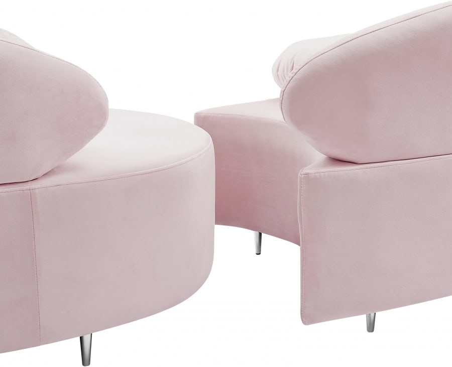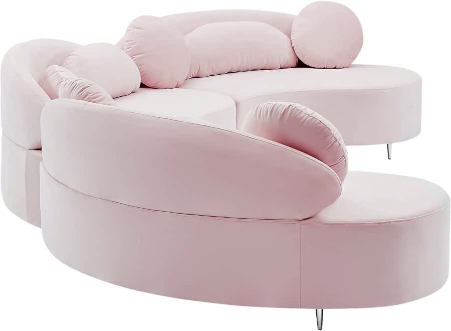 Give your sitting area a touch of Hollywood glam with this Vivacious velvet sectional. This boudoir-inspired sectional couch offers ample room for your favorite peeps to hand out and relax. Its soft pink velvet upholstery adds to its elegant demeanor, and it comes with both gold and chrome legs, so you can put a custom spin on your new sectional. Pillows are included for even more bliss-inducing comfort.