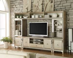 Ent. CenterThis collection brings you a sophisticated and bright living area. The Entertainment center will make your room look bigger visually. Dimesions: 116″ X 18″ X 80″HMax TV Size: 60″ Flat Screen *Item NOT Eligible for Return/Refund*