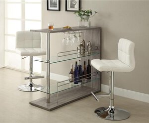 Bar Table & (2) StoolsEntertain your friends in total style with this sleek contemporary bar unit. This piece features 2 glass storage shelves and a wine glass holder to store all your drink-making needs. Finished in a weathered grey finish and detailed with chrome accents, this is a sophisticated looking piece.Bar Table Dimensions: 47.25×15.75×44\”HBar Stool Dimensions: 19×16.25×36.25-41.50\”H*Item NOT Eligible for Refund/Return*