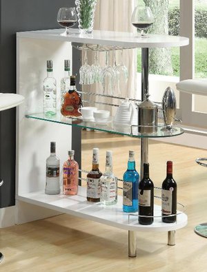 Bar TableThis contemporary bar table is a sleek option for your living room or dining room. The unit includes a unique shape with an arch shape to the table top and shelves. A center glass shelf complements the white color, and chrome color accents on the railing, feet, and support road. Stemware storage where you can hang wine glasses adds to the sophisticated style of this bar unit.Dimensions: 39.25\”L x 15.75\”W x 41\”H*Item NOT Eligible for Refund/Return*